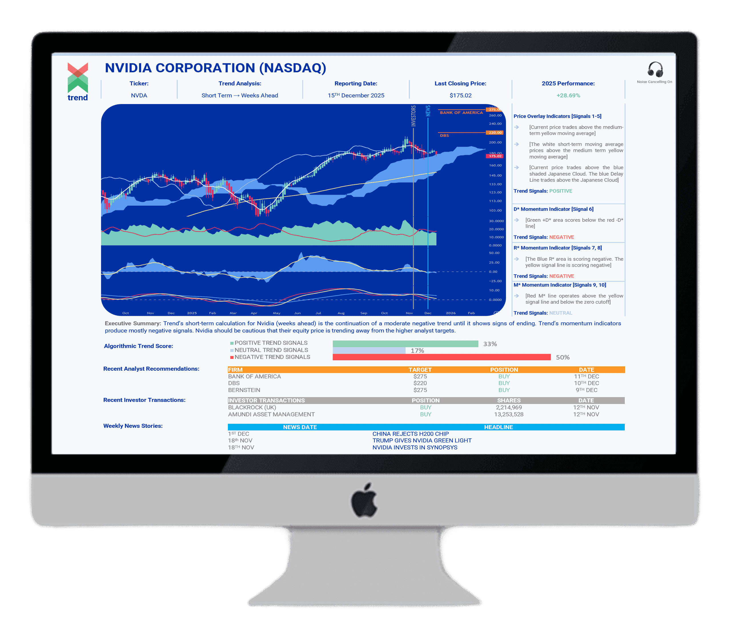 Now, Trend Intelligence repurposes trend-following algorithms for corporate issuers, serving as a forward-looking tool for a company’s securities prices, related indices, or currencies or commodities that can affect its valuation. Trend uses well-known ‘textbook’ trend-following indicators from the world of quantitative finance and seeks to establish itself as a standard bearer for trend-following reporting.
