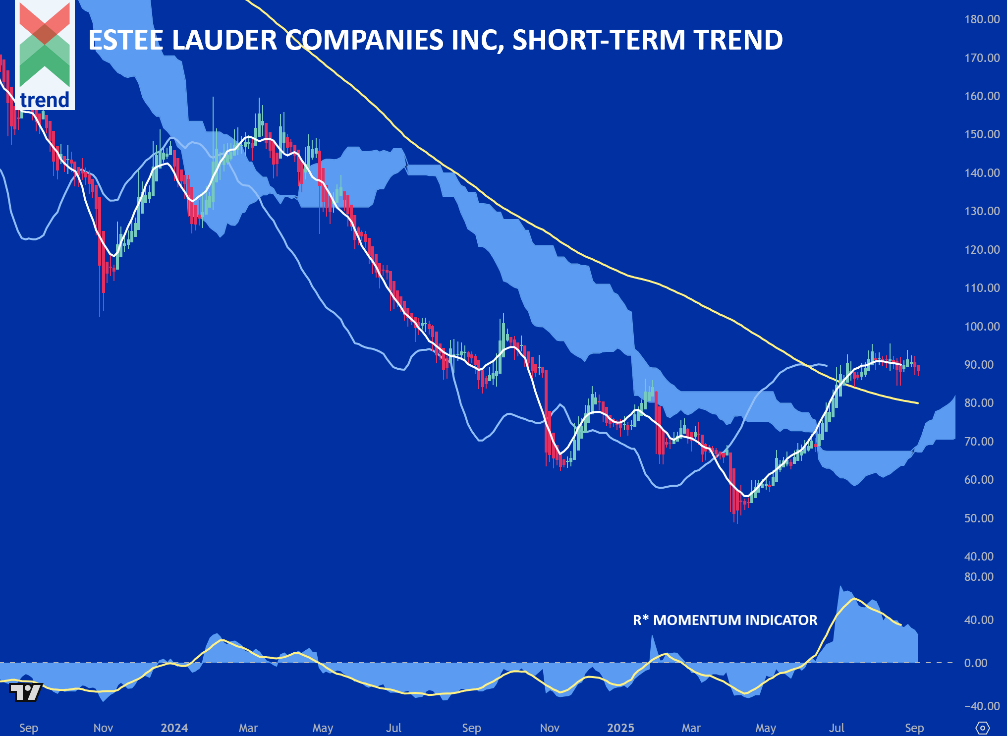 In addition to our R* Momentum model, Estée Lauder’s price trades above Trend’s medium-term (yellow) moving average and Trend’s Japanese Cloud (shaded in blue). With respect to all signals, Trend Intelligence remains short-term trend positive on Estée Lauder until the trend shows signs of ending.